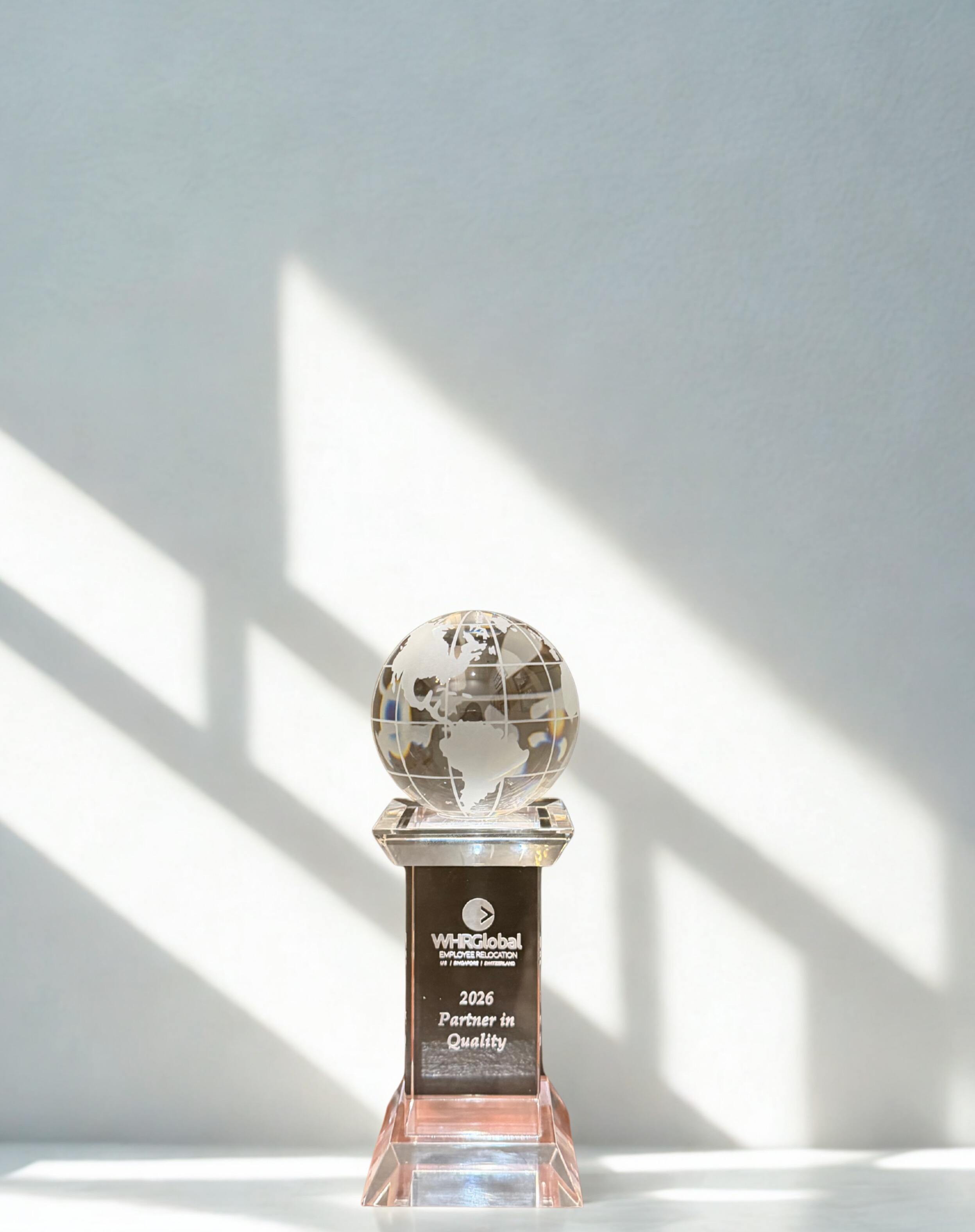 Physical WHR Partner in Quality Award, presented to Suite Home Corporate Housing, glass award with globe on top on white background.